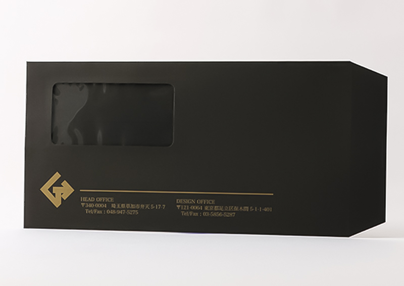 金色でロゴをワンポイント入れるだけでも、ぐっと印象的な黒い封筒に仕上がります。また紙が黒色のため、中身が透けないというメリットもございます。